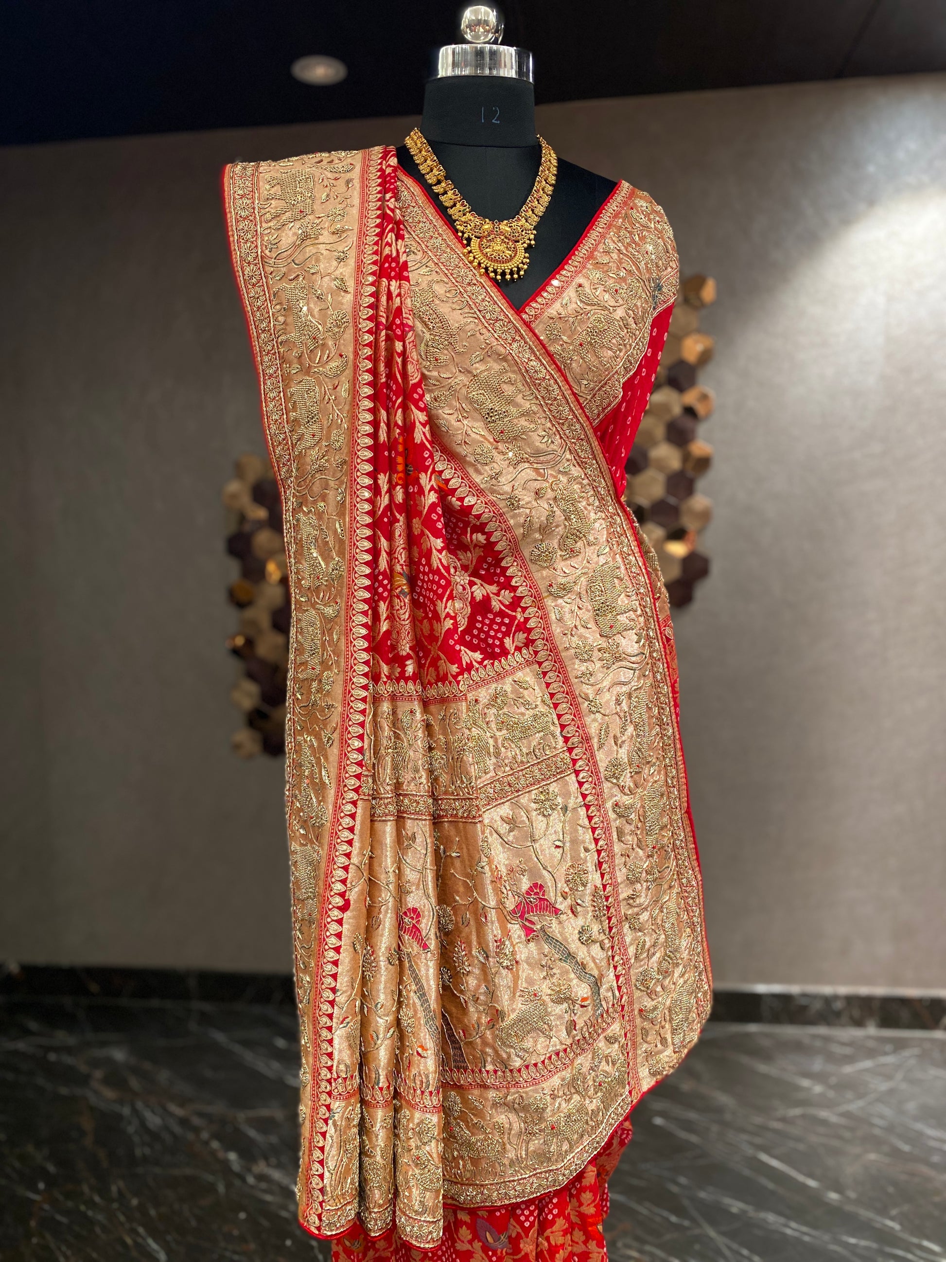 This vibrant red pure Bandhej saree showcases exquisite traditional handwork, reflecting skilled craftsmanship. The intricate tie-dye patterns and delicate embellishments enhance its rich texture, making it ideal for festive occasions or celebrations. Crafted with care, this saree offers a timeless appeal combined with cultural elegance.