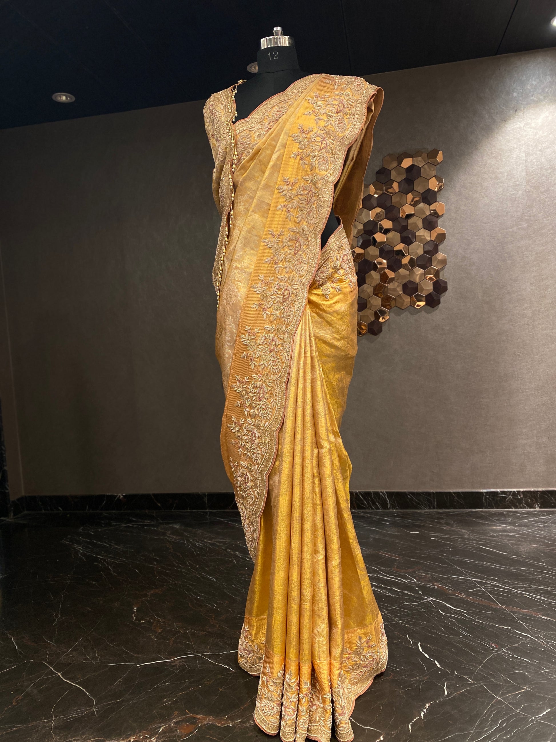 A regal golden peach Kanjivaram saree adorned with exquisite hand embroidery featuring floral and paisley motifs. The rich zari detailing and delicate embellishments enhance its timeless charm, making it a perfect choice for weddings and grand celebrations.