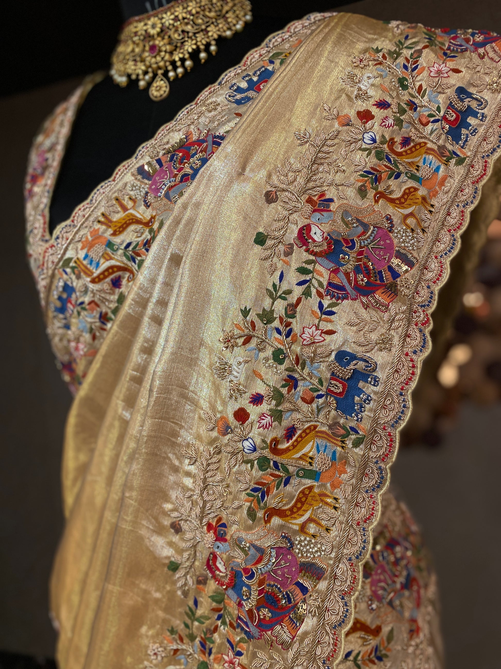 A regal Kanjivaram tissue saree in a rich golden hue, adorned with exquisite hand embroidery depicting royal processions of elephants, peacocks, and other motifs. The intricate detailing and vibrant threads bring alive scenes of heritage artistry, making it a timeless heirloom piece for grand occasions.